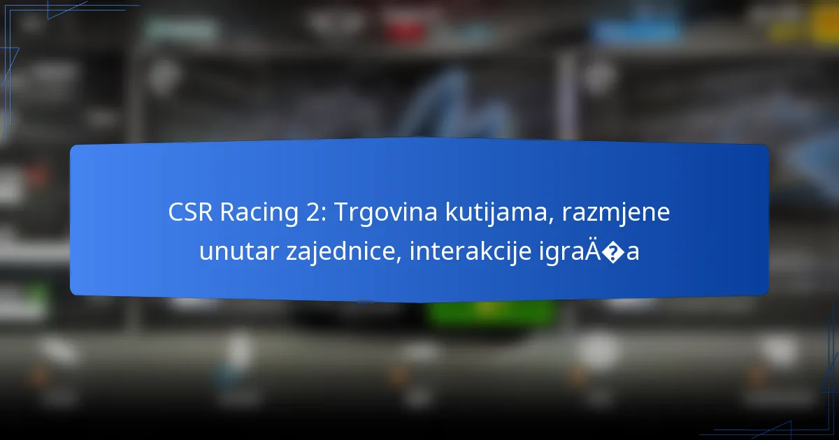 Trgovina kutijama u CSR Racing 2 omogućuje igračima razmjenu kutija koje sadrže razne predmete, poboljšavajući njihovo iskustvo igranja. Ova značajka promiče interakciju unutar zajednice i pruža prilike za stjecanje rijetkih automobila i nadogradnji putem trgovanja s drugim igračima.