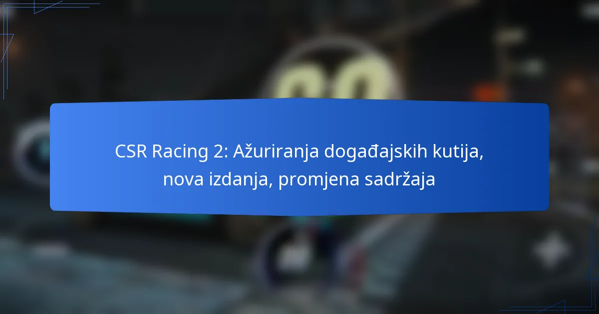 Najnovija ažuriranja događajnih kutija CSR Racing 2 uključuju značajne promjene u sadržaju, učestalosti ažuriranja i uvođenju novih predmeta koji poboljšavaju igranje. Ova ažuriranja imaju za cilj održati igru svježom i zanimljivom za igrače, odgovarajući na povratne informacije zajednice i razvijajući mehaniku igranja.