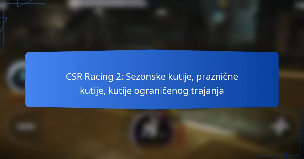Kutije ograničenog trajanja u CSR Racing 2 su posebne nagrade koje igrači mogu steći na kratko vrijeme, često povezane s sezonskim događajima ili promocijama. Ove kutije obično sadrže vrijedne predmete, kao što su automobili, nadogradnje i valuta, što ih čini vrlo traženima.